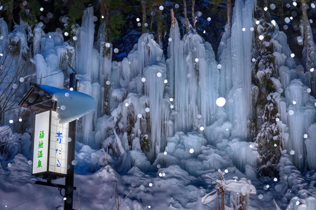 福地温泉街の木々に沢の水を噴射して氷の柱を再現しライトアップします。