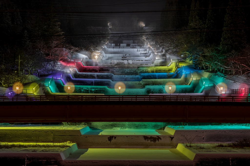 用LED燈光鮮豔地照亮洞谷的雪景。彷彿看到了盛開的櫻花。