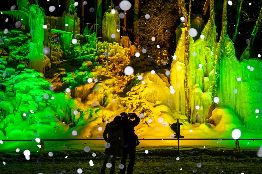 前方形成的冰雕被色彩鮮豔地裝飾,緩和了奧飛驒嚴冬的寒冷。